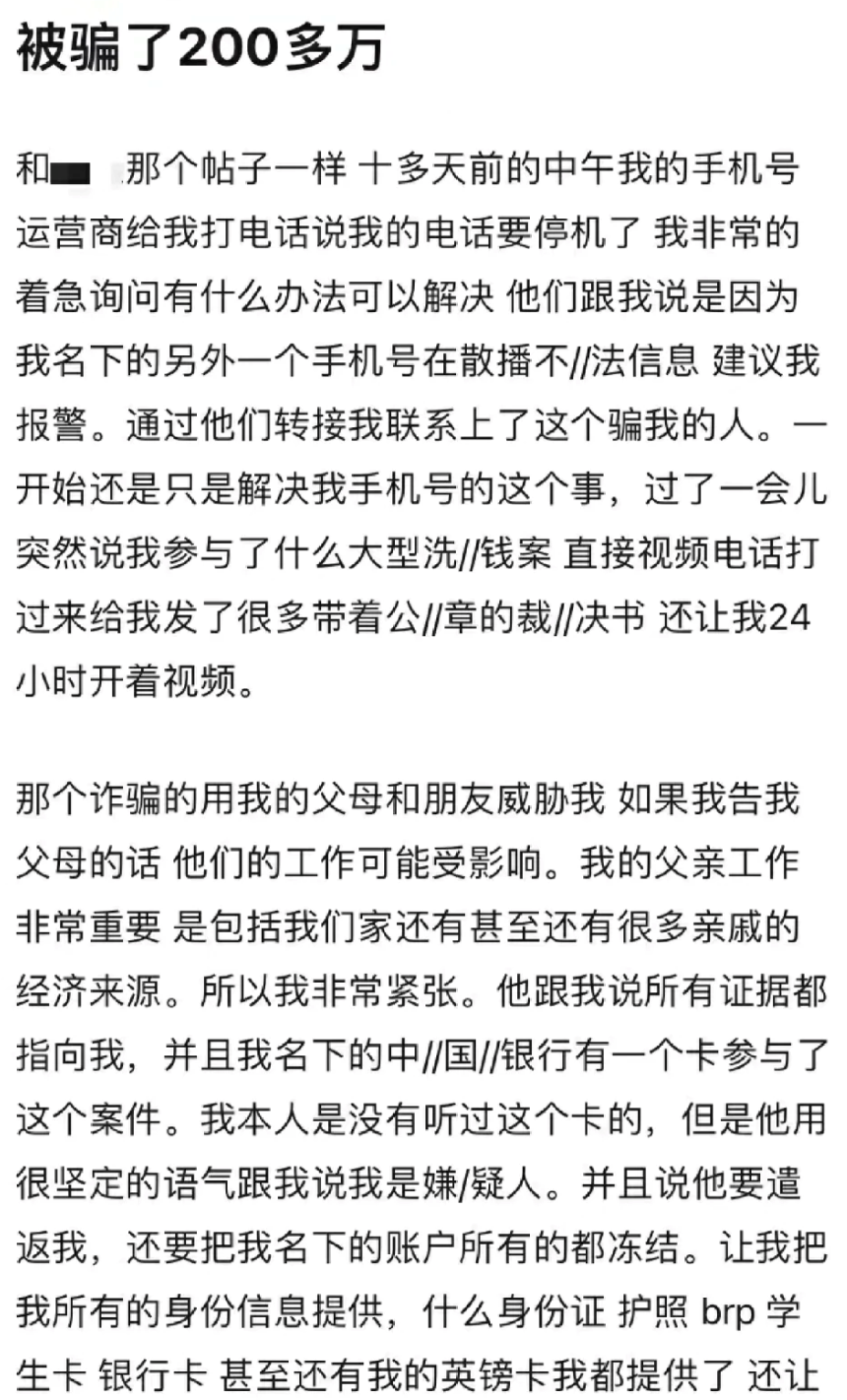 前不久,一名小红书博主发文称自己被诈骗200多万元,且被骗子威胁不准告诉父母?