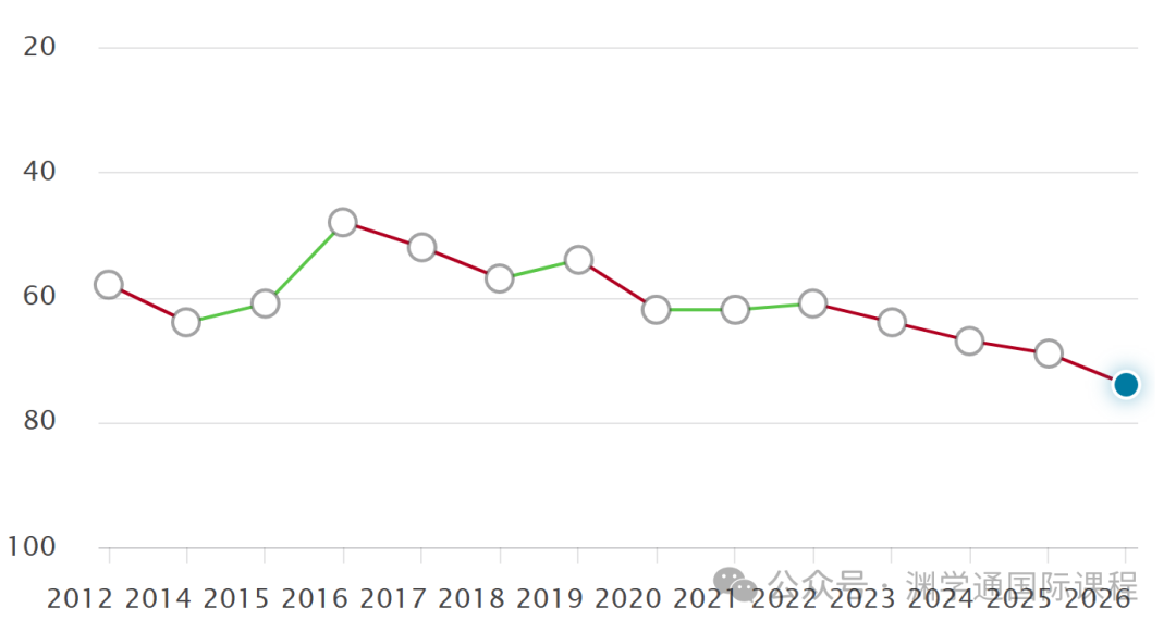 QS官网数据显示,2012至2026这15年间,华威大学的排名从峰值第48位跌至第74位,跌了26名之多!